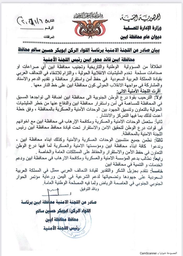أبين..قيادة السلطة المحلية والأجهزة الأمنية والعسكرية ترحب بقوات درع الوطن وحوار الرياض