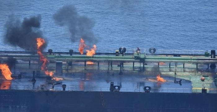 Abandoned Greek-flagged oil tanker on Fire after attack