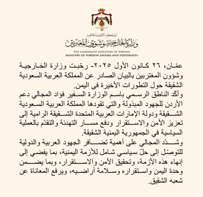 الأردن يرحب بالبيان الصادر عن السعودية بشأن اليمن