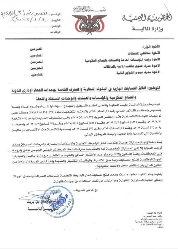 وزارة المالية توجه بإغلاق حسابات القطاعات الحكومية في البنوك التجارية