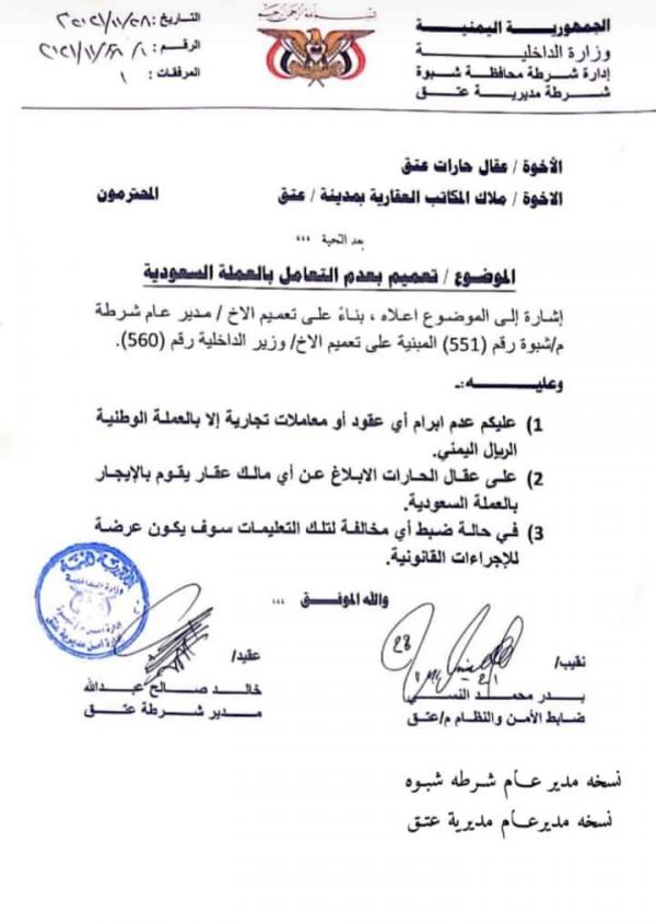 إيقاف التعامل بالعملة الأجنبية في التعاملات التجارية بشبوة