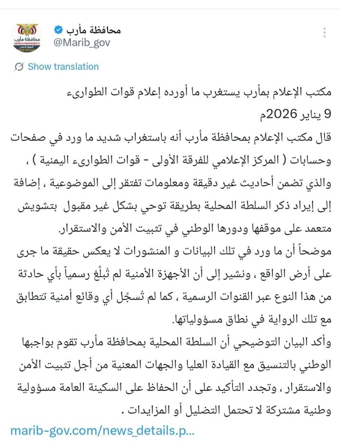 إعلام مارب يفنّد مزاعم "قوات الطوارئ" ويؤكد لا صحة للأنباء المتداولة حول الحوادث الأمنية