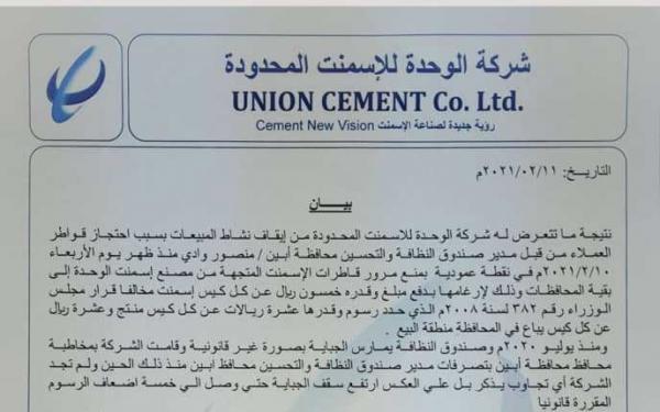 شركة أسمنت يمنية تعتزم توقيف نشاطها وتسريح عمالها بسبب تعدد الجبايات