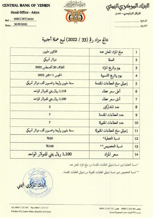 البنك المركزي يعلن نتائج مزاد جديد بسعر 1100 ريال للدولار