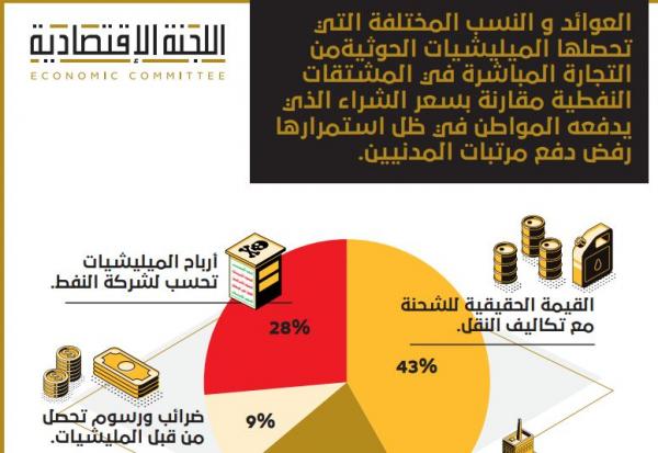 كشفت اللجنة الاقتصادية أن المليشيات الحوثية تحقق أرباحا وفوائد من تجارة المشتقات النفطية تصل إلى 130 في المائة اجمالي قيمة الشحنات المستوردة والمتاجرة فيها بشكل مباشر مقارنة مع 59 في المائة ارباح تتحصلها في حال شراء المواطنين للمشتقات النفطية من التجار الوطنيين.