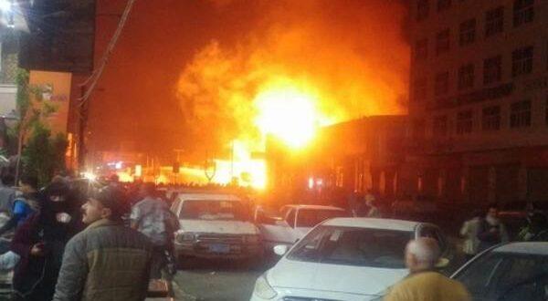 اندلع حريق في سوق سوداء لبيع المشتقات النفطية في الشارع العام بحي نقم بالقرب من مسجد الريان بالعاصمة صنعاء الخاضعة لسيطرة ميليشيا الحوثي.