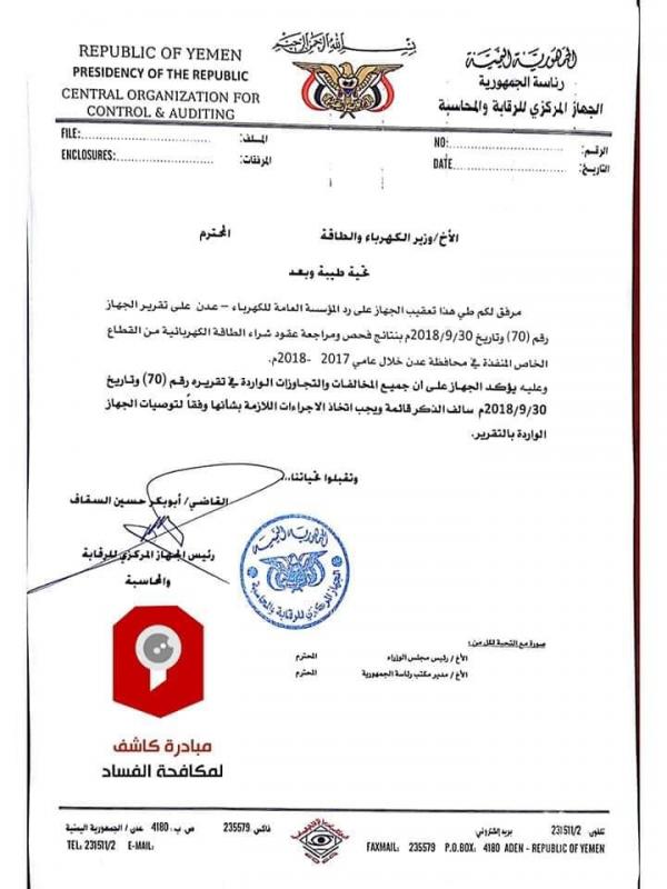 كشفت وثيقة رسمية صادرة عن الجهاز المركزي للرقابة والمحاسبة عن فضيحة فساد وتلاعب بالمال العام في أحد مشاريع تأهيل الطاقة الكهربائية بمدينة عدن تقدر بمئات الملايين .