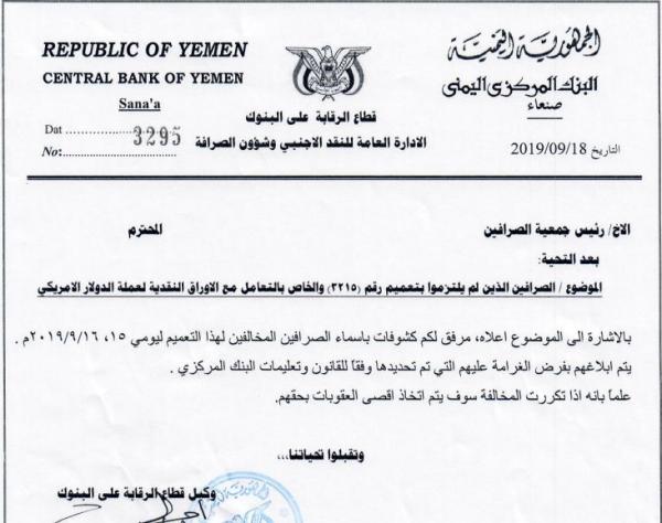 وحصلت اليمن اليوم على وثيقة صادرة من قطاع الرقابة على البنوك بالبنك المركزي في صنعاء تتضمن تعميما إلى جمعية الصرافين لابلاغها بالغرامات المفروضة على الصرافين لعدم التزامهم بالتعليمات الحوثية والتي تصدرها في اطار السياسة النقدية الخاصة بالجماعة في مناطق سيطرتها.