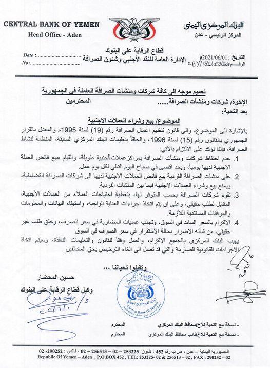 وجه البنك المركزي اليمني في عدن كافة الشركات ومنشآت الصرافة العاملة في الجمهورية بعدم الاحتفاظ بمراكز عملات أجنبية طويلة والقيام ببيع فائض العملة الأجنبية لديها يومياً وبحد أقصى في صباح اليوم التالي لكل يوم عمل .