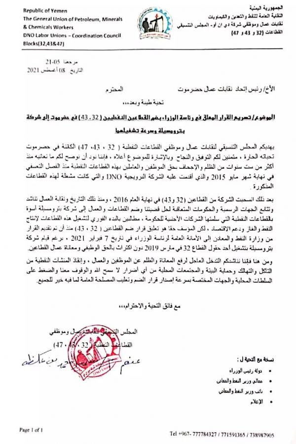 دعا المجلس التنسيقي لنقابات عمال وموظفي القطاعات النفطية بحضرموت إلى سرعة ضم القطاعين النفطيين (32 ، 43) في حضرموت إلى شركة بترومسيلة وسرعة تشغيلهما وتسريع القرار المعلق في رئاسة الوزراء .