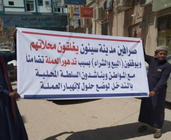 ونظّم عدد من مالكي شركات الصرافة وقفة احتجاجية أمام مقر فرع البنك المركزي بسيئون رافعين لافتات أعلنوا فيها إغلاق محلات الصرافة .