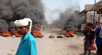 تتواصل موجة الاحتجاجات في محافظة لحج حيث قطع المحتجون طريقاً رئيسياً وأغلقوا المحلات التجارية مطالبين بوضع حلول عاجلة لانهيار العملة والحد من ارتفاع أسعار المواد الغذائية التي أدت إلى تردي الوضع المعيشي للمواطنيين .
