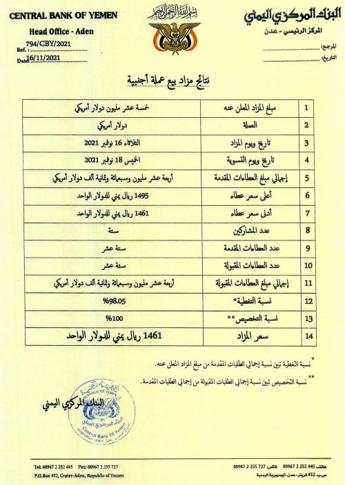 وقال البنك في بيان له إن إجمالي مبلغ العطاءات المقبولة بلغ 14 مليون و708 آلاف دولار ليحدد سعر المزاد بـ 1461 ريال يمني للدولار الواحد .