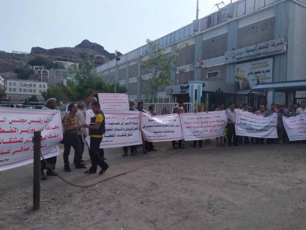 يواصل موظفو شركة النفط في عدن وقفاتهم الاحتجاجية أمام مبنى محافظة عدن استجابة لدعوة مجلس اللجان النقابية احتجاجا على تجاوزات وتعديات مصافي عدن على نشاط شركة النفط التجاري .