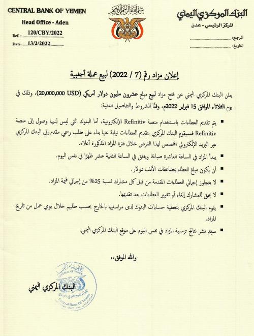 رفع البنك المركزي في عدن مزاده السابع منذ مطلع العام الجاري إلى عشرين مليون دولار بعد أن كان طوال خمسة أشهر لا يتجاوز 15 مليون دولار في كل مزاد .