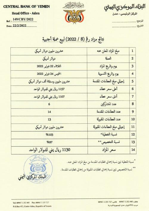أعلن البنك المركزي اليمني نتائج مزاد جديد لبيع مبلغ 20 مليون دولار أمريكي عبر منصة «Refinitiv» الإلكترونية .
