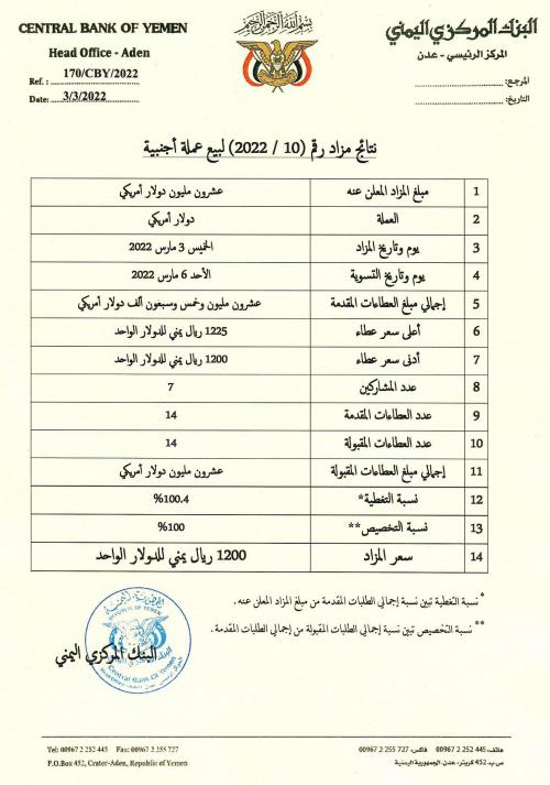 أعلن البنك المركزي نتائج المزاد رقم (10-2022) لبيع مبلغ عشرين مليون دولار أمريكي .