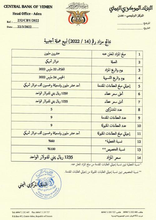 أعلن البنك المركزي اليمني عدن نتائج المزاد 14 – 2022 لبيع عشرين مليون دولار أمريكي .