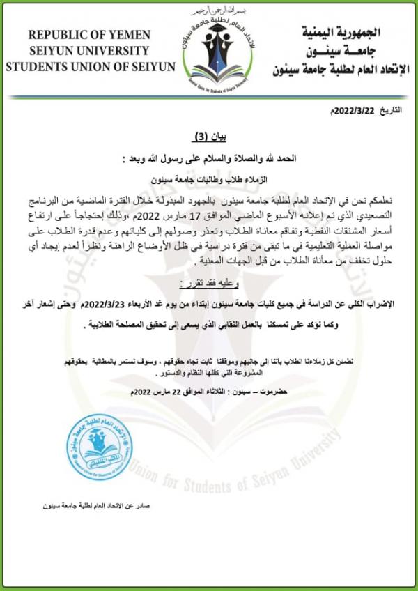 بدأ الاتحاد العام لطلبة جامعة سيئون بمحافظة حضرموت تنفيذ اضراب شامل في جميع الكليات حتى إشعار آخر احتجاجاً على ارتفاع أسعار المواصلات الناجم عن ارتفاع أسعار المشتقات النفطية .