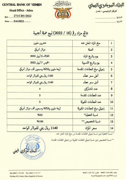 أعلن البنك المركزي اليمني عدن نتائج المزاد 16 – 2022 لبيع عشرين مليون دولار أمريكي .