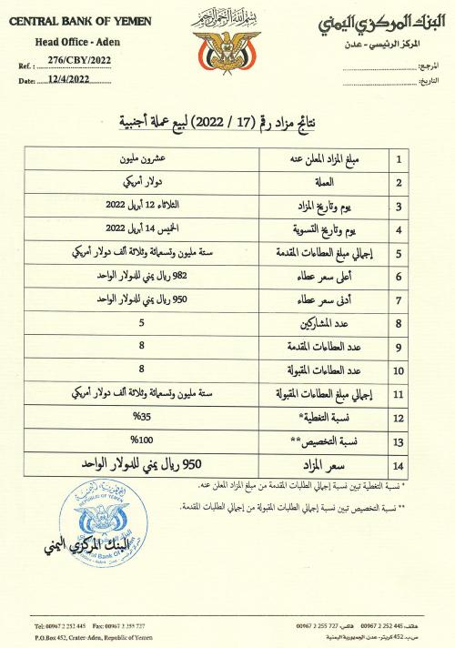 أعلن البنك المركزي اليمني عدن نتائج المزاد 17 – 2022 لبيع عشرين مليون دولار أمريكي .
