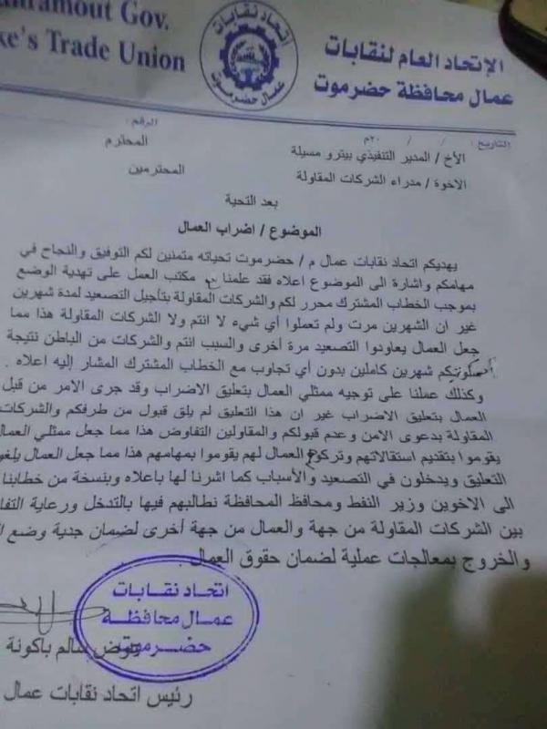 طالب مكتب وزارة الشؤون الاجتماعية بساحل حضرموت واتحاد نقابات عمال حضرموت رؤساء اللجان النقابية وممثلي العاملين بالشركات المقاولة قطاع 14 بالمسيلة برفع الاضراب الفوري وحملهم المسؤولية في حال عدم رفع الاضراب الذي تسبب في توقف العمل بالشركة الأم بترومسيلة والشركات العاملة بالقطاع 14 .