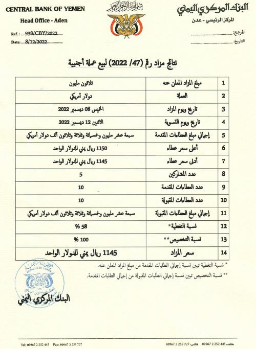 يأتي هذا في وقت أرسى البنك المركزي اليمني في عدن في مزاده الـ 47 سعر الدولار بـ 1145 ريالاً أي مقترباً من سعر السوق المصرفية الموازية .
