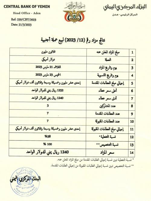 أعلن البنك المركزي اليمني عدن نتائج بيع 11.5 مليون دولار من أصل 30 ميلوناً عرضها للبيع في مزاد علني بسعر صرف أعلى بـ 23 ريال من سعر صرف أول مزاد بعد وصول الوديعة السعودية بلغ 1240 ريال لكل دولار .