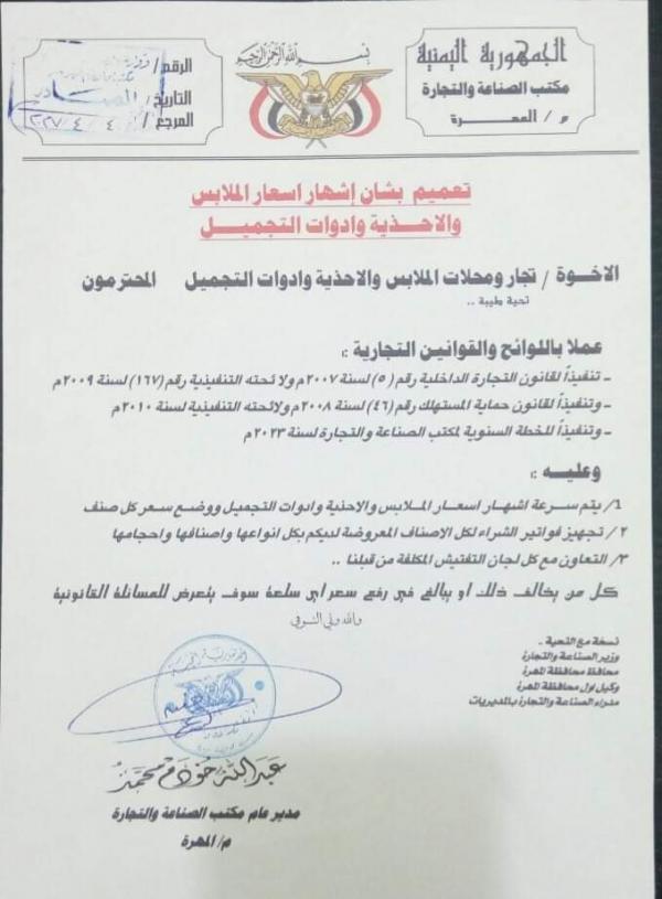 أصدر مكتب وزارة الصناعة والتجارة بمحافظة المهرة تعميماً بشأن إشهار أسعار الملابس والأحذية وأدوات التجميل .