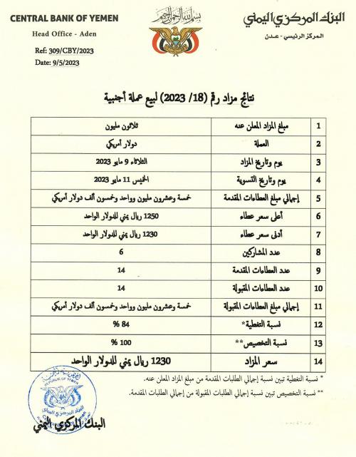 أعلن البنك المركزي اليمني في عدن نتائج المزاد رقم 18 – 2023 لبيع 30 مليون دولار.