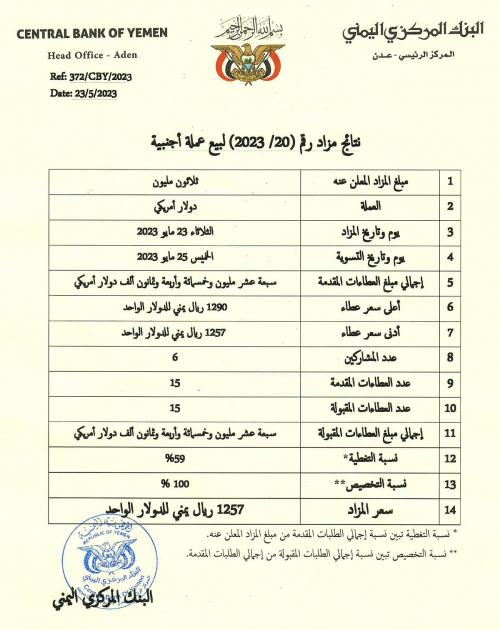 يأتي هذا في وقت أعلن فيه البنك المركزي نتائج مزاده رقم 20 – 2023 لبيع ثلاثين مليون دولار بسعر 1257 ريالاً للدولار .