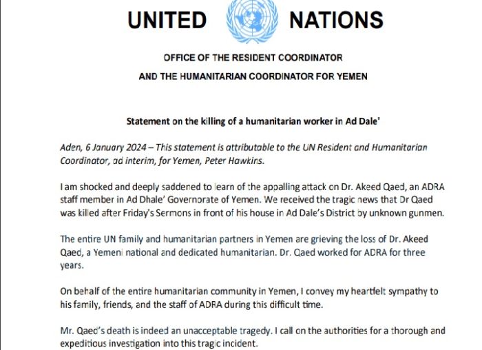 The UN Resident and Humanitarian Coordinator for Yemen expressed his sadness to learn about the assassination of one of staff in Dhale’ Governorate of Yemen.