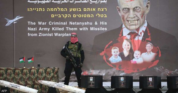 باللغات العربية والعبرية والإنجليزية، حملت اللافتة المرافقة للجثامين رسالة واضحة: "قتلهم مجرم الحرب نتنياهو وجيشه النازي بصواريخ الطائرات الحربية الصهيونية".