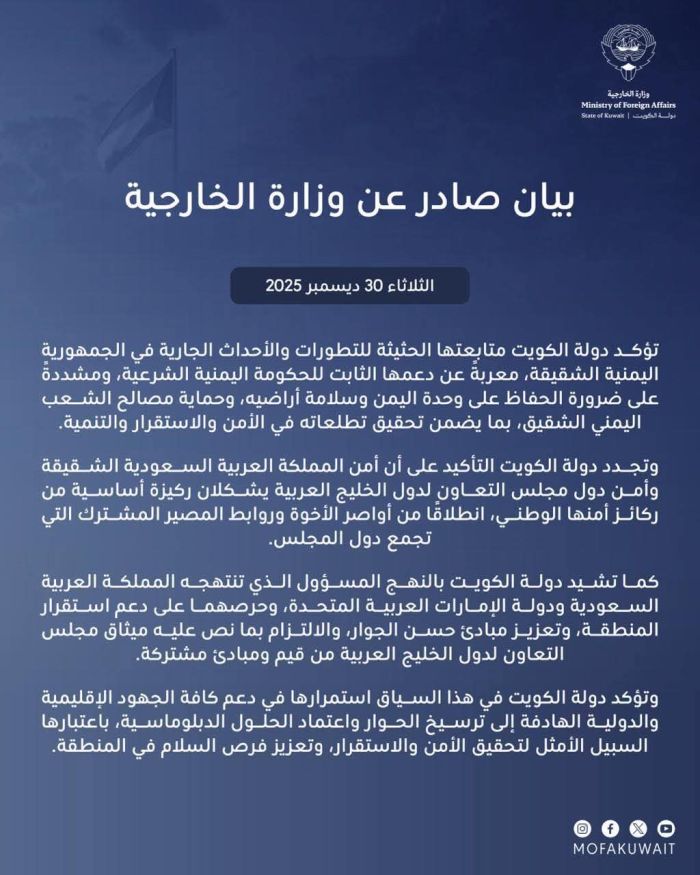 أصدرت وزارة الخارجية لدولة الكويت بياناً رسمياً أكدت فيه متابعتها الحثيثة للتطورات والأحداث الجارية في الجمهورية اليمنية الشقيقة، مشددة على موقفها الثابت والداعم للحكومة اليمنية الشرعية.