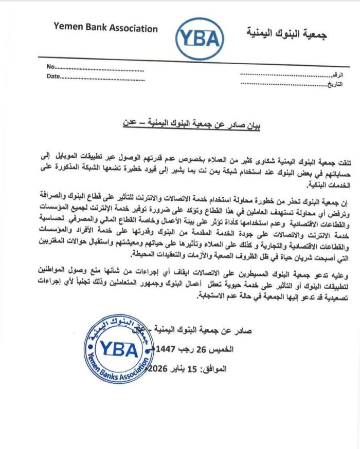 أصدرت جمعية البنوك اليمنية في عدن بياناً عاجلاً حذرت فيه من تداعيات خطيرة تواجه القطاع المصرفي نتيجة قيود تقنية تفرضها شبكة الاتصالات (يمن نت)، مؤكدة تلقيها شكاوى واسعة من العملاء بشأن تعثر الوصول إلى الخدمات البنكية عبر التطبيقات الذكية.