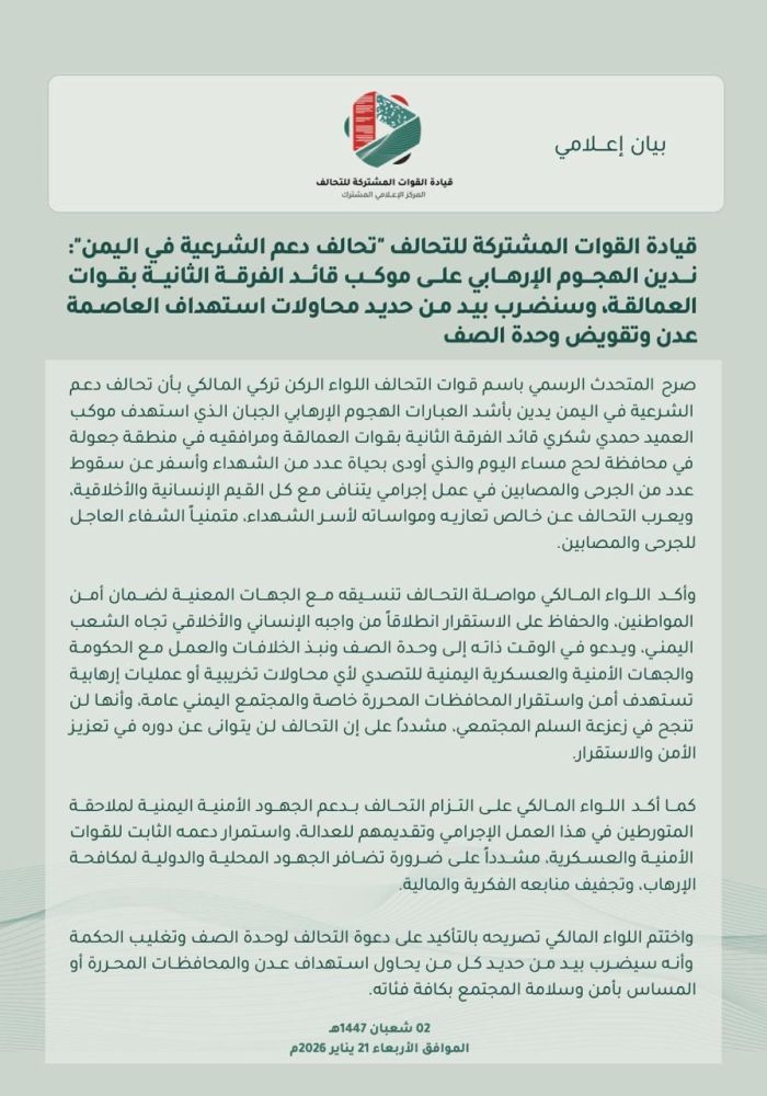أدانت قيادة القوات المشتركة لـ "تحالف دعم الشرعية في اليمن"، بأشد العبارات، الهجوم الإرهابي الجبان الذي استهدف مساء اليوم موكب العميد حمدي شكري، قائد الفرقة الثانية بقوات العمالقة، ومرافقيه في منطقة "جعولة" بمحافظة لحج، والذي أسفر عن سقوط عدد من الشهداء والجرحى.